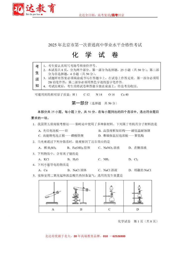2025北京高中第一次合格考已结束,为了方便同学们了解各科试题情况,北达教研组整理了2025北京高中第一次合格考化学试题及答案,需要的小伙伴赶紧下载练习起来吧: